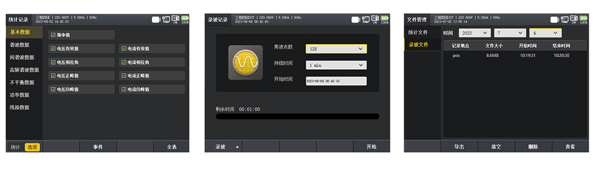 支持多达800多种电能质量测量参数的最大值、最小值、平均值、cp95值的数据统计记录功能,并支持电能质量暂态事件、越限事件的监测记录。支持128/256/512/1024点每周波的实时波形记录功能,录波文件采用标准comtrade格式文件。